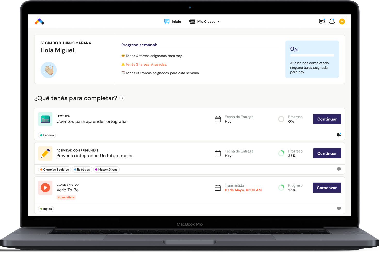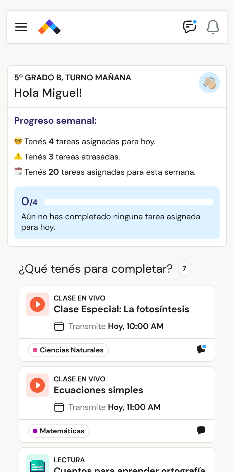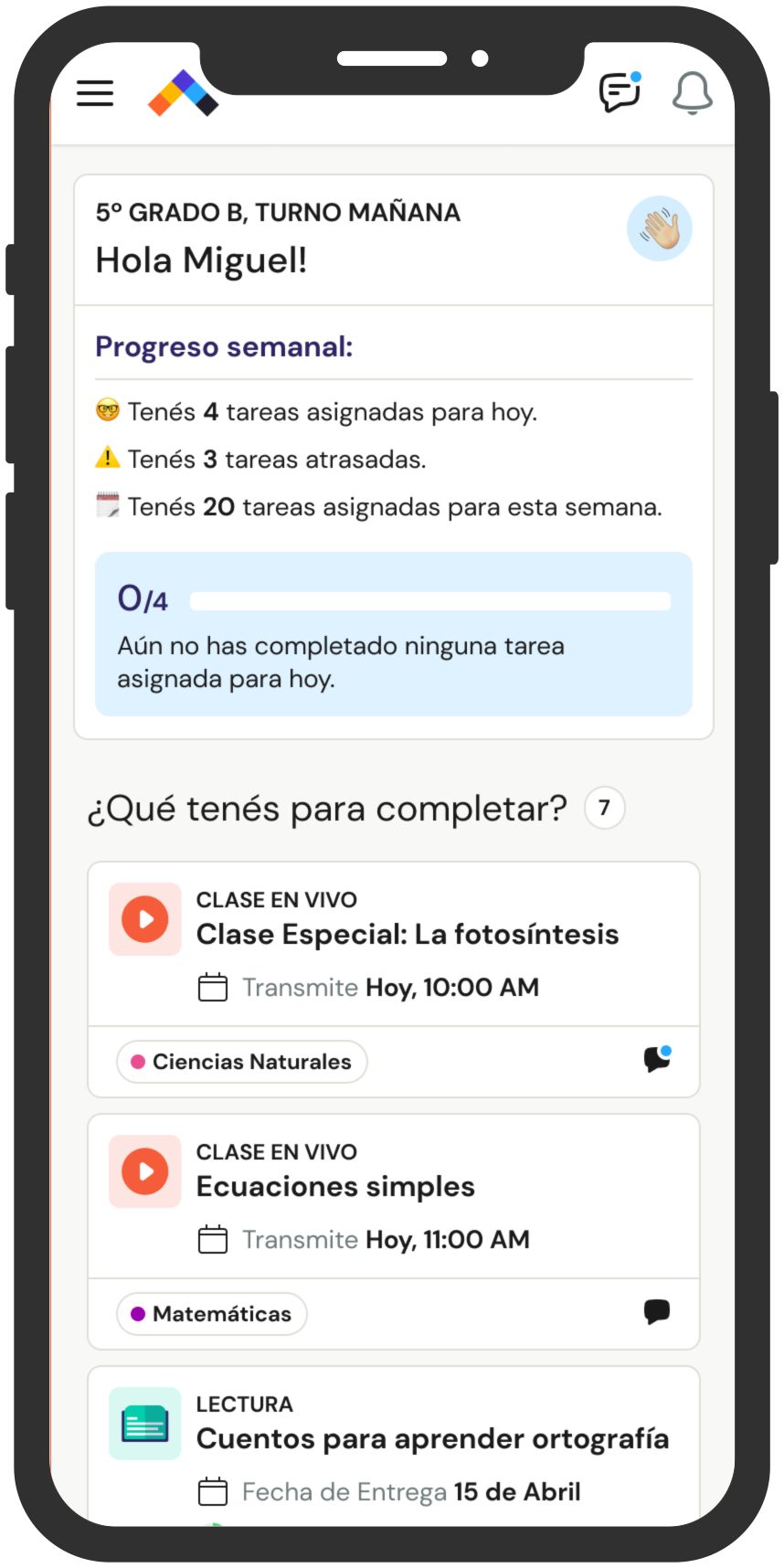 planificación diaria, semanal y mensual, tener clases en vivo, gestionar tareas y exámenes, ver el detalle de calificaciones, almacenar archivos...